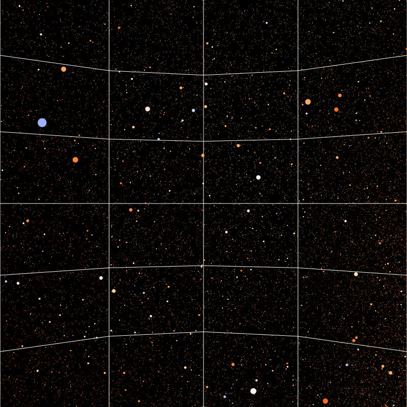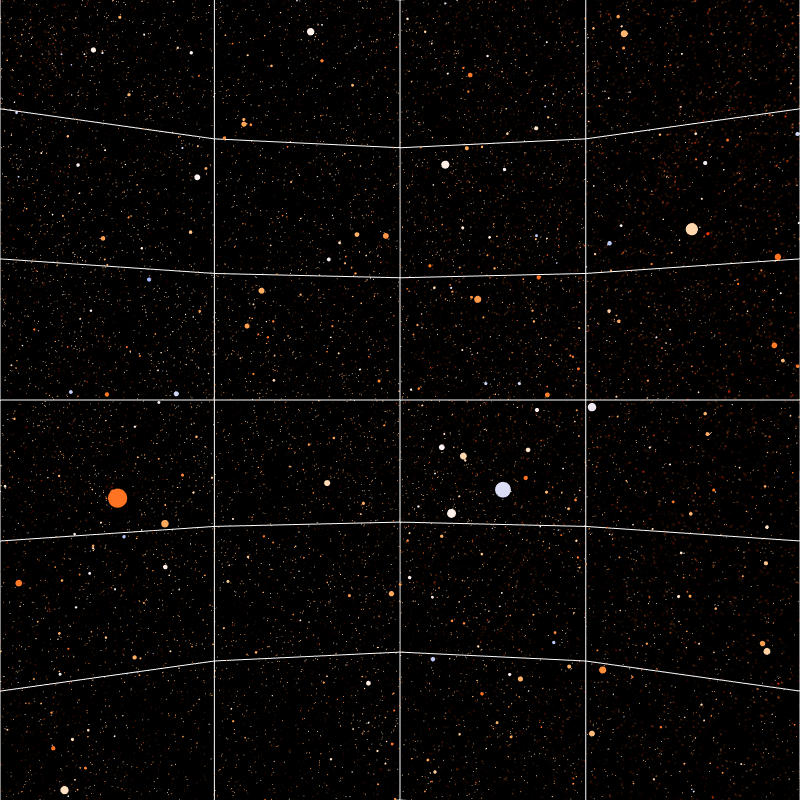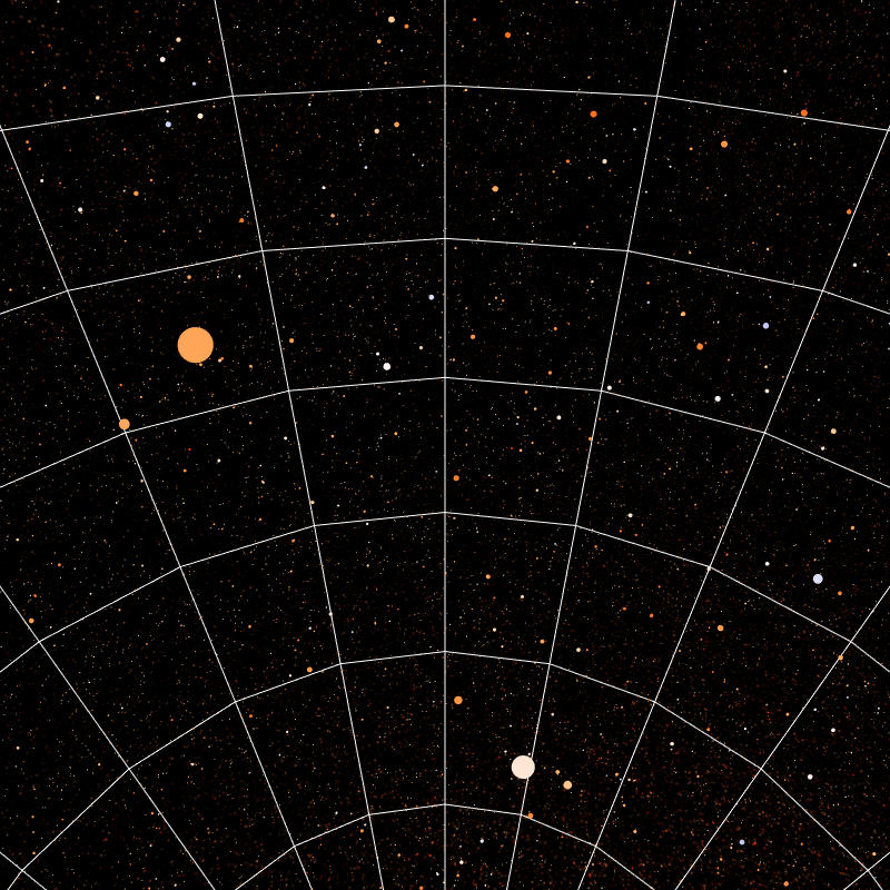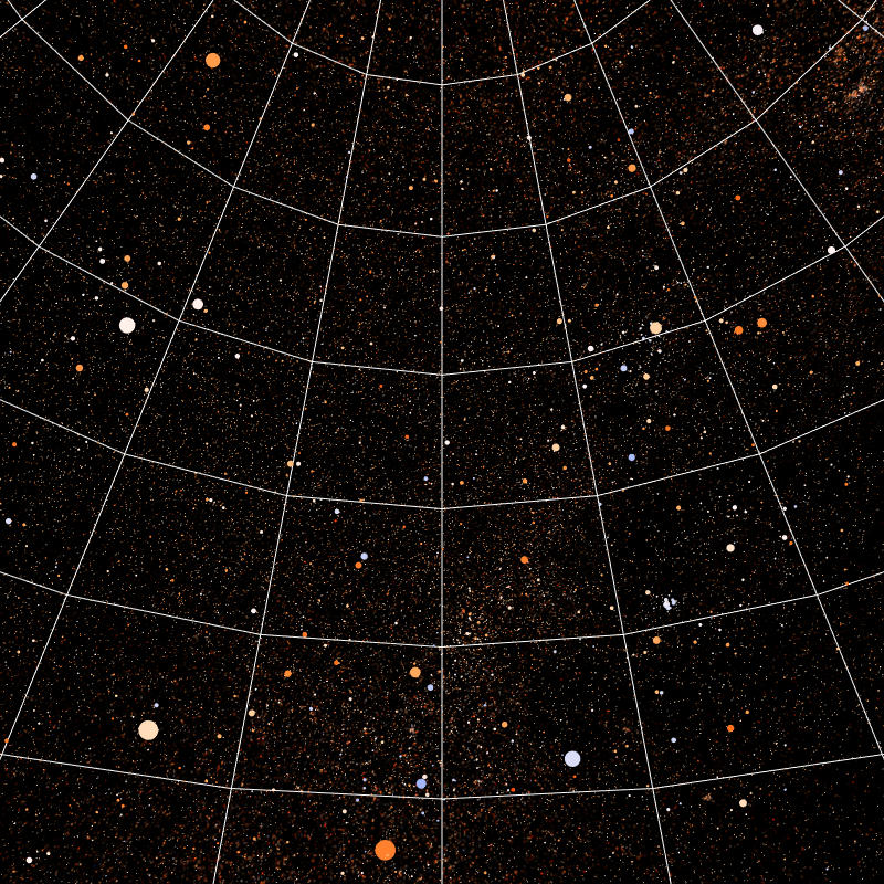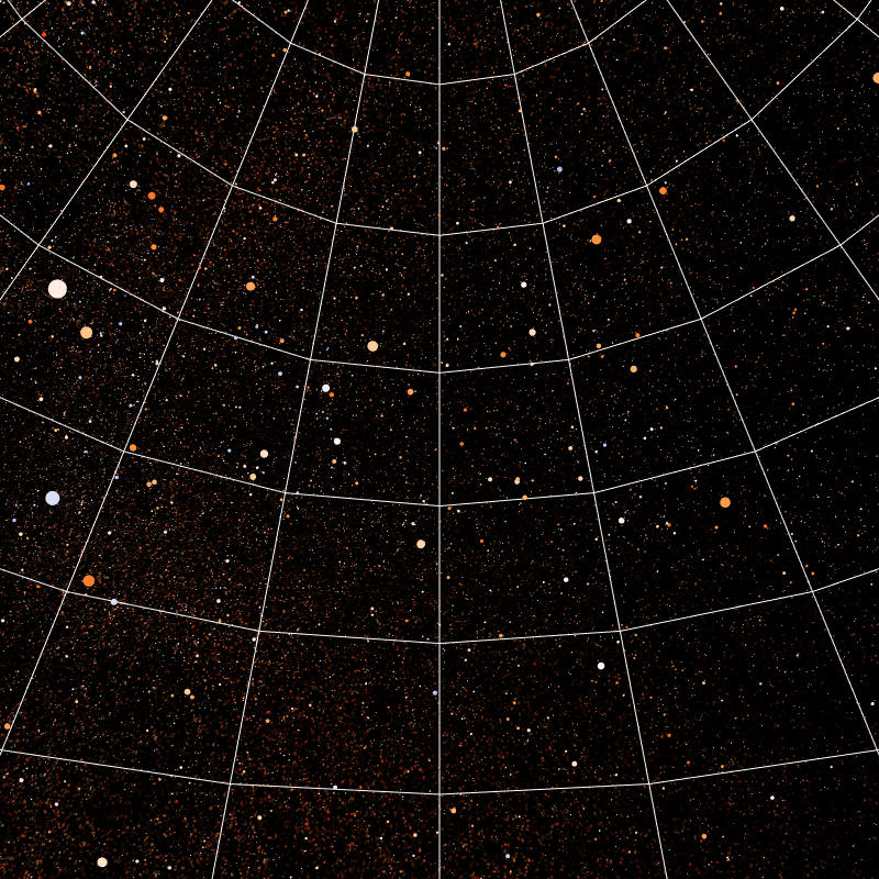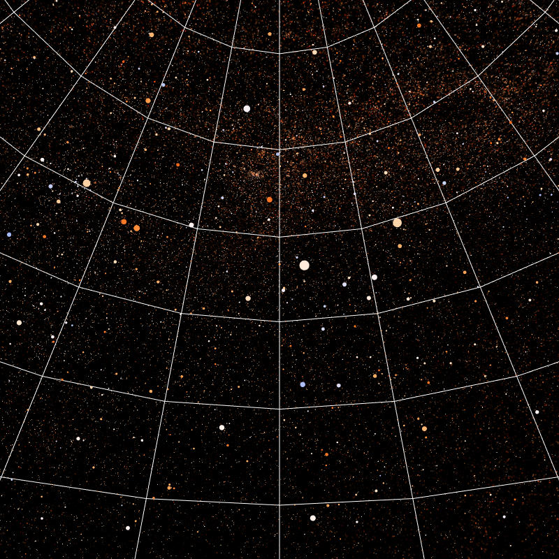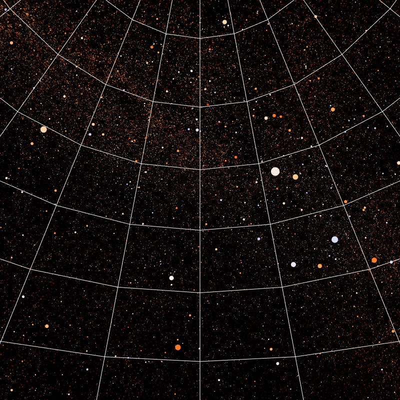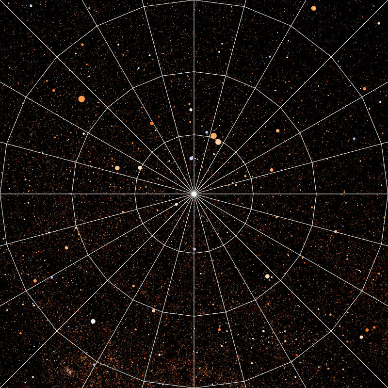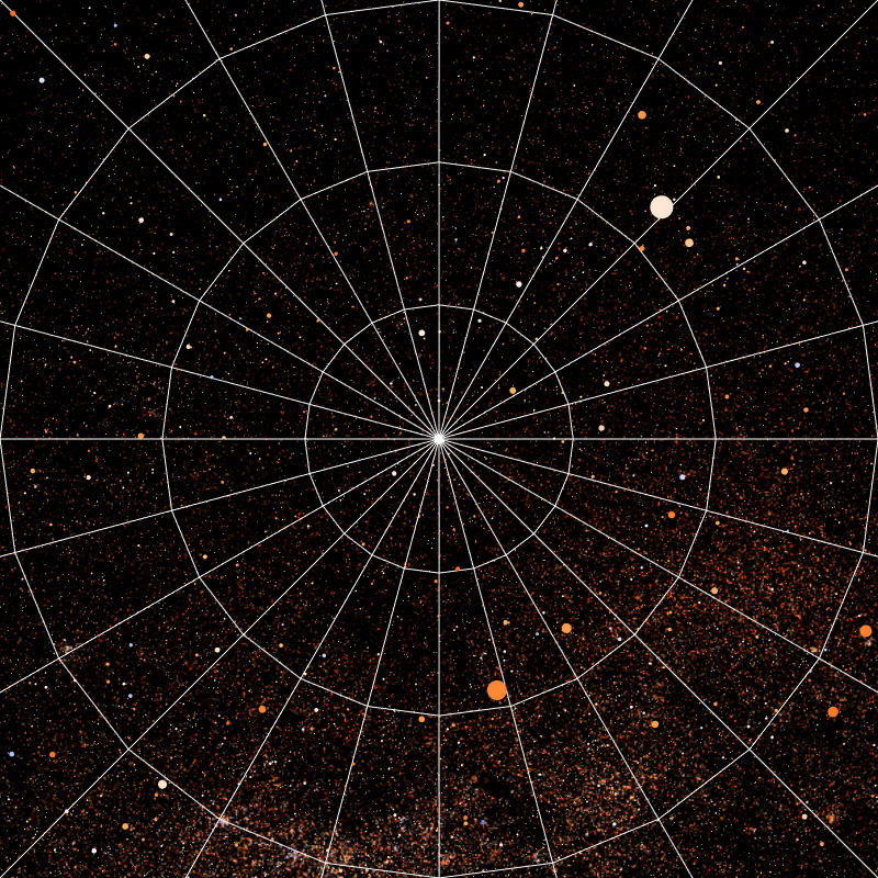 ![]() RA 0h, DE 90N (bottom: 0h, left: 6h, top: 12h, right: 18h. largest circle: 60N) This is the direction where we would usually see the polar star right in the center. However, since our distance to this star is about 430 ly, its position does not shift very much. It can now be found at 7h15 76N. The brighter, more reddish star in the top left is tau Sgr. In the bottom left we can find the blue-white gamma Cas, and right below it the two open clusters chi and h Persei. Their positions did not change noticeably, due to the huge distance of more than 7000 ly. |