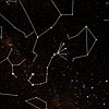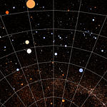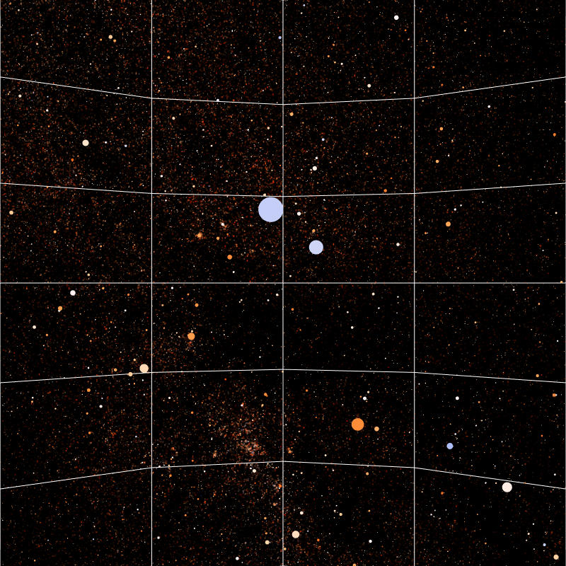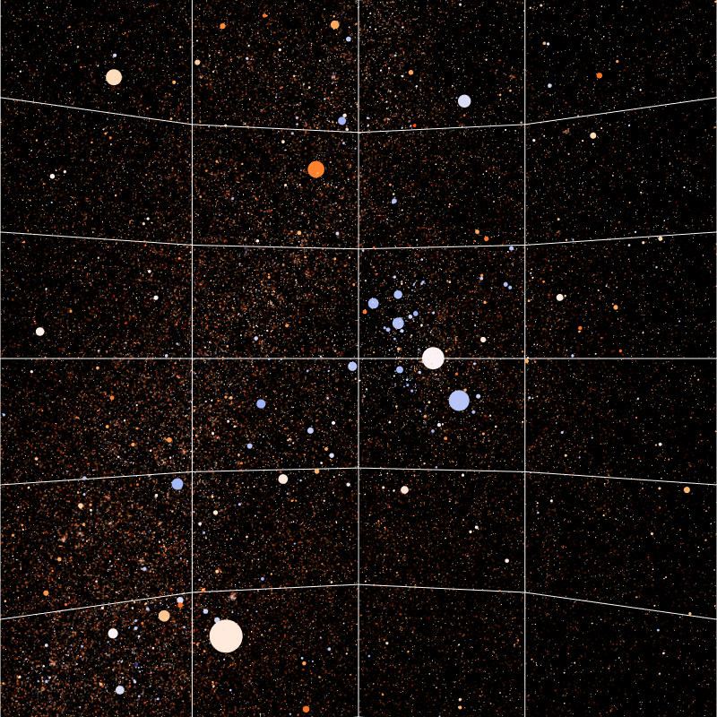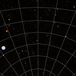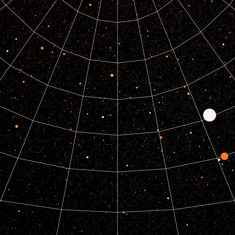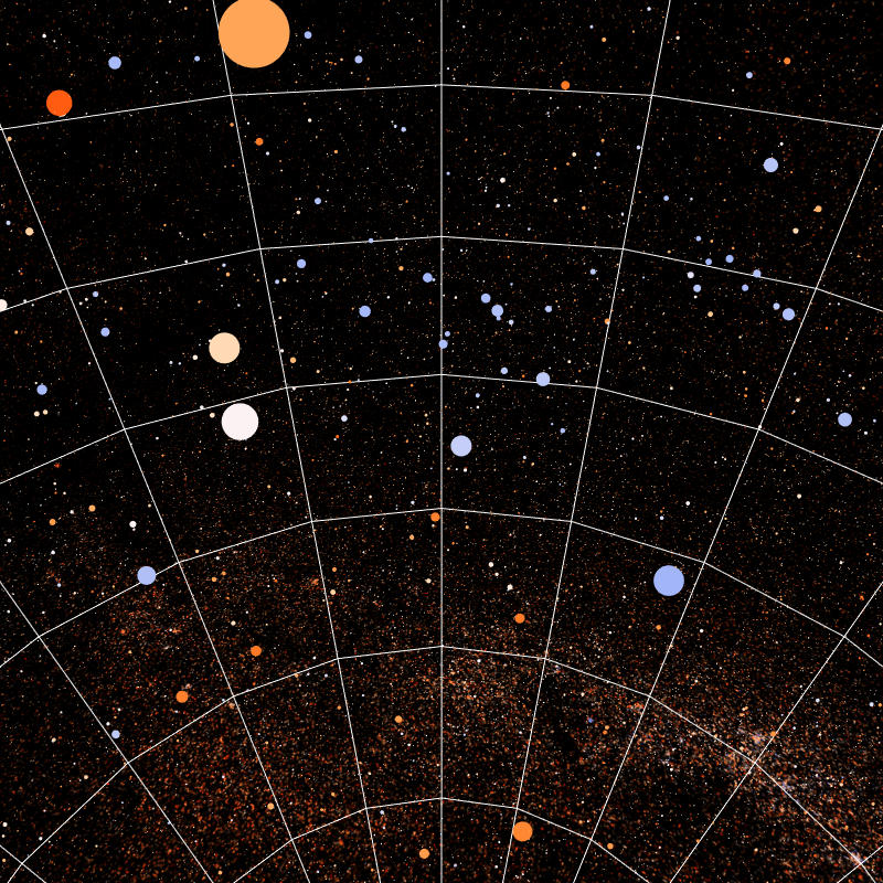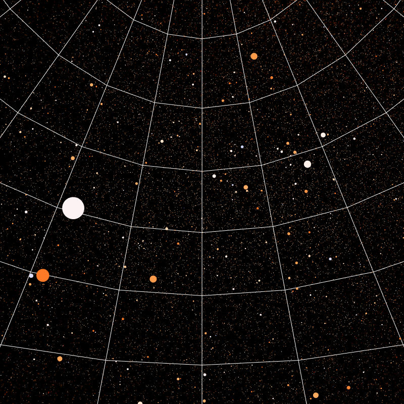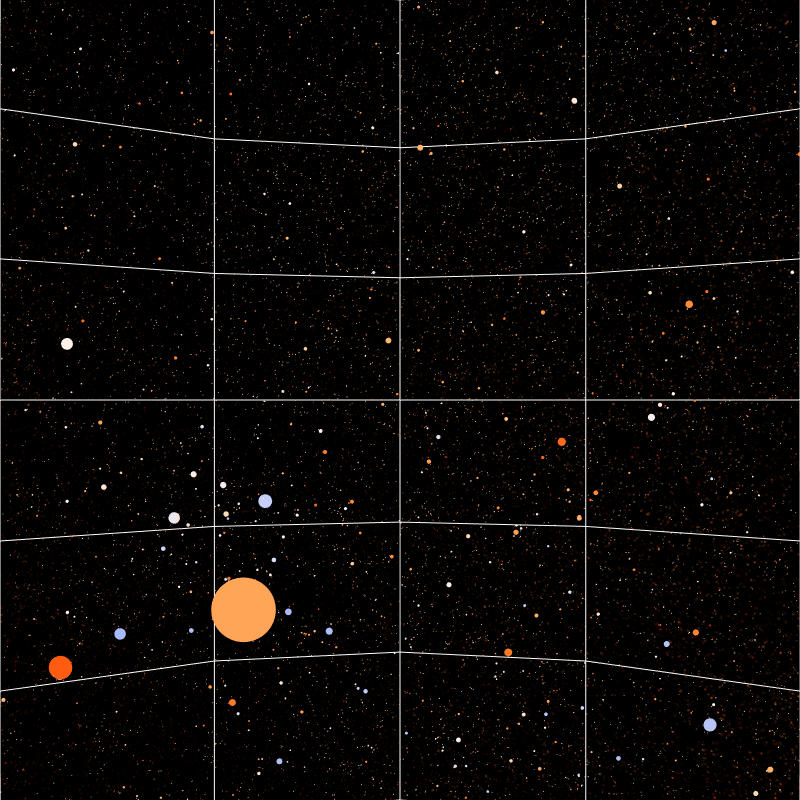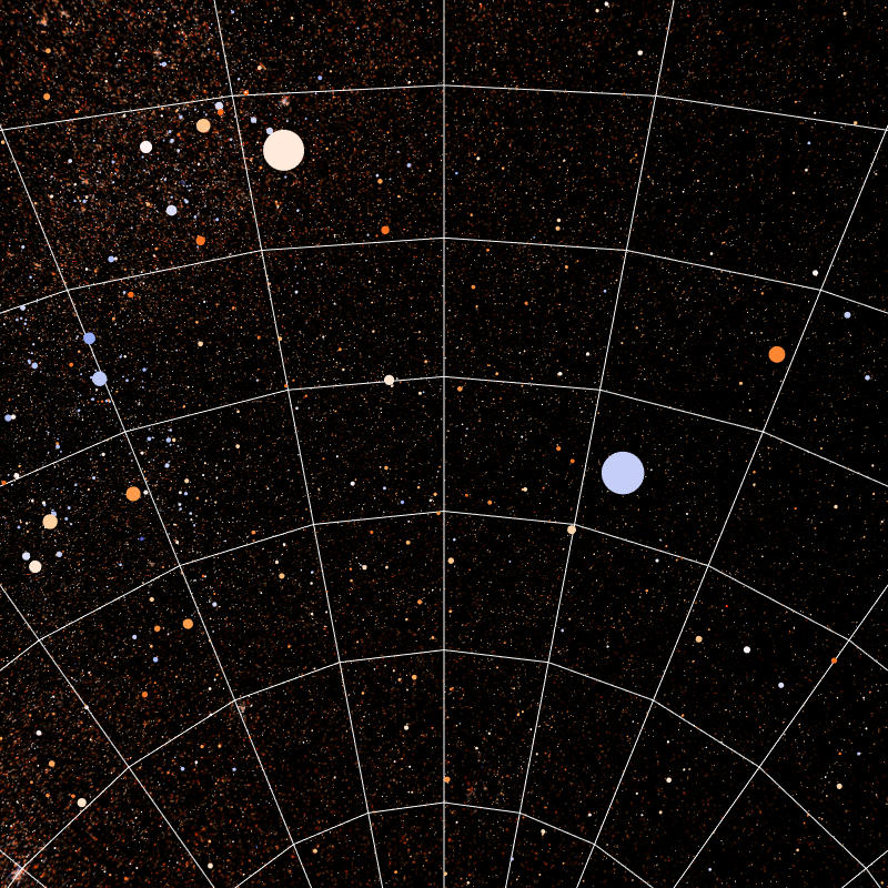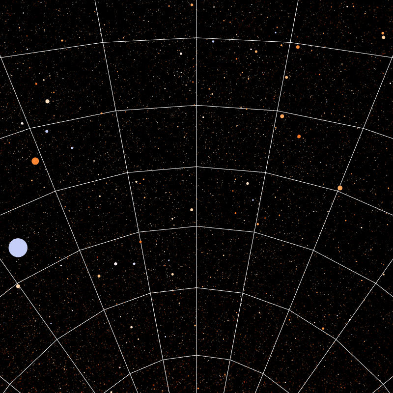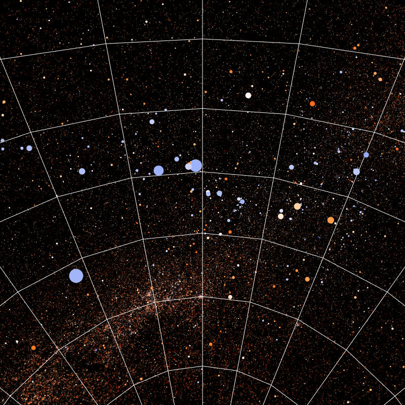 ![]() RA 6h, DE 45N (top left corner: 10h 60N, top right corner: 2h 60N) Our Sun is in this image! But since it is much less powerful than Rukbat, its apparent brightness is just 7.9m - it is not visible for the naked eye. Its location is the inverse of Rukbat's: 7h23m, 40deg36m. The cluster of blue stars in the lower right are the Pleiades (500 ly, half as bright as seen from Earth). |
