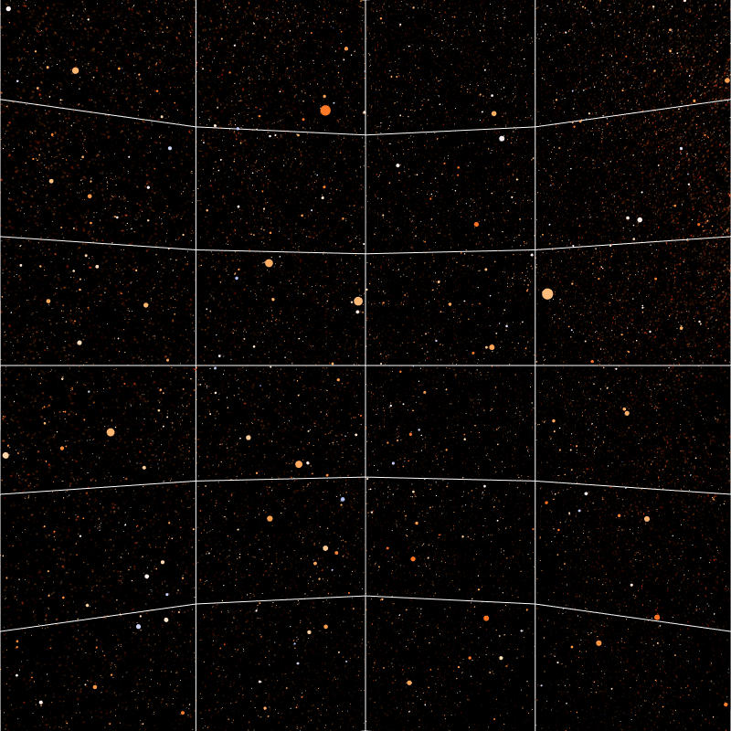 ![]() RA 6h, DE 0N (bottom: 30S, left: 8h, top: 30N, right: 4h) The rather distorted Orion constellation (compare to the Orion movie above). |