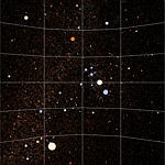 ![]() RA 6h, DE 45S (bottom left corner: 10h 60S, bottom right corner: 2h 60S) Canopus, our second brightest star. A bit on the yellowish side, and only slightly darker when looking at it from Rukbat (345 ly, -0.4m). To the right is once more alpha Pavo. |